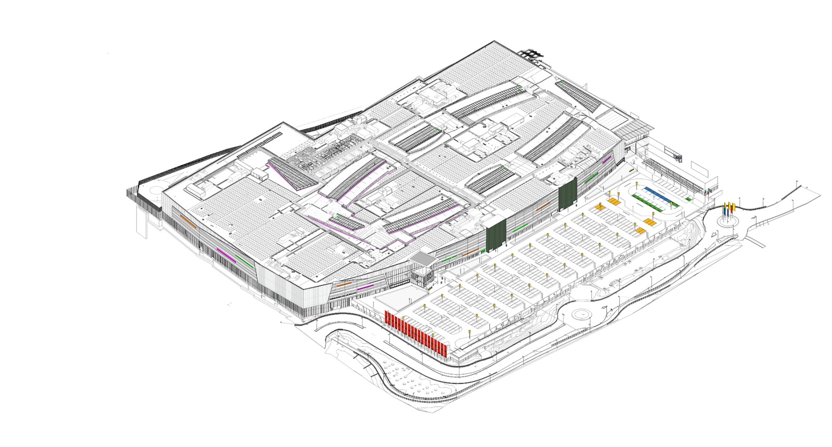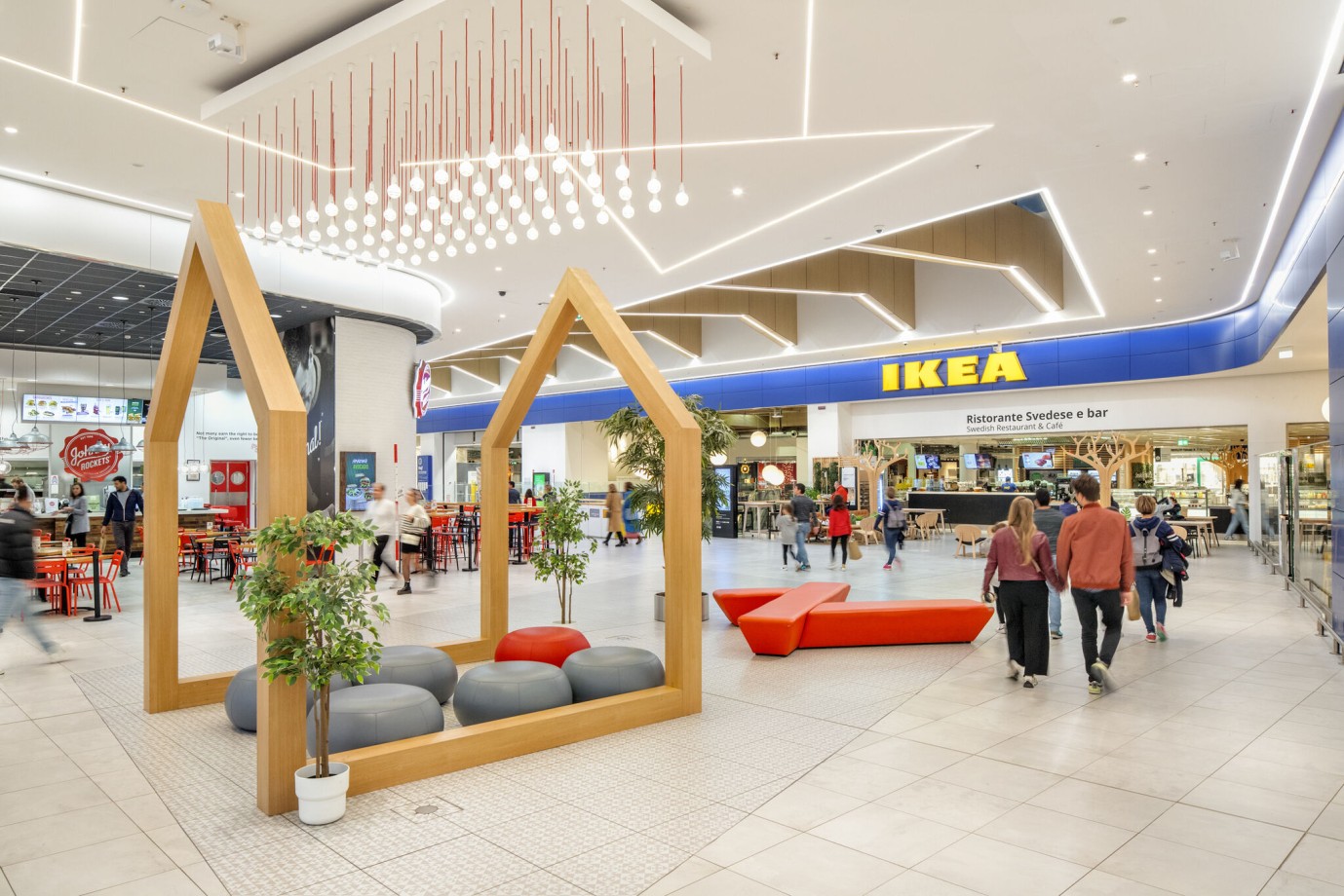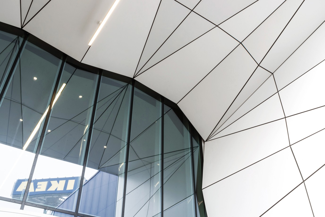 L'edificio ha un carattere distintivo, fortemente caratterizzato dalla gamma di colori, scelti in linea con il branding dei Centri IKEA. Ai livelli commerciali, la facciata è aperta verso l'esterno tramite "fessure" per consentire connessioni tra l'interno e l'esterno. Queste sono situate in tre aree chiave associate ai due nodi principali (ingressi sud e nord), fornendo viste dagli spazi interni principali verso l'esterno. La terrazza della Food Court incoraggia le vedute delle colline a nord. Per l'interno, il tema dominante è l'illuminazione naturale, che permea in modo controllato attraverso i lucernari e i pozzi di luce.