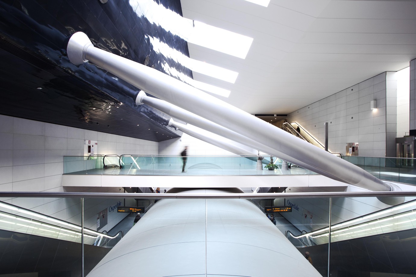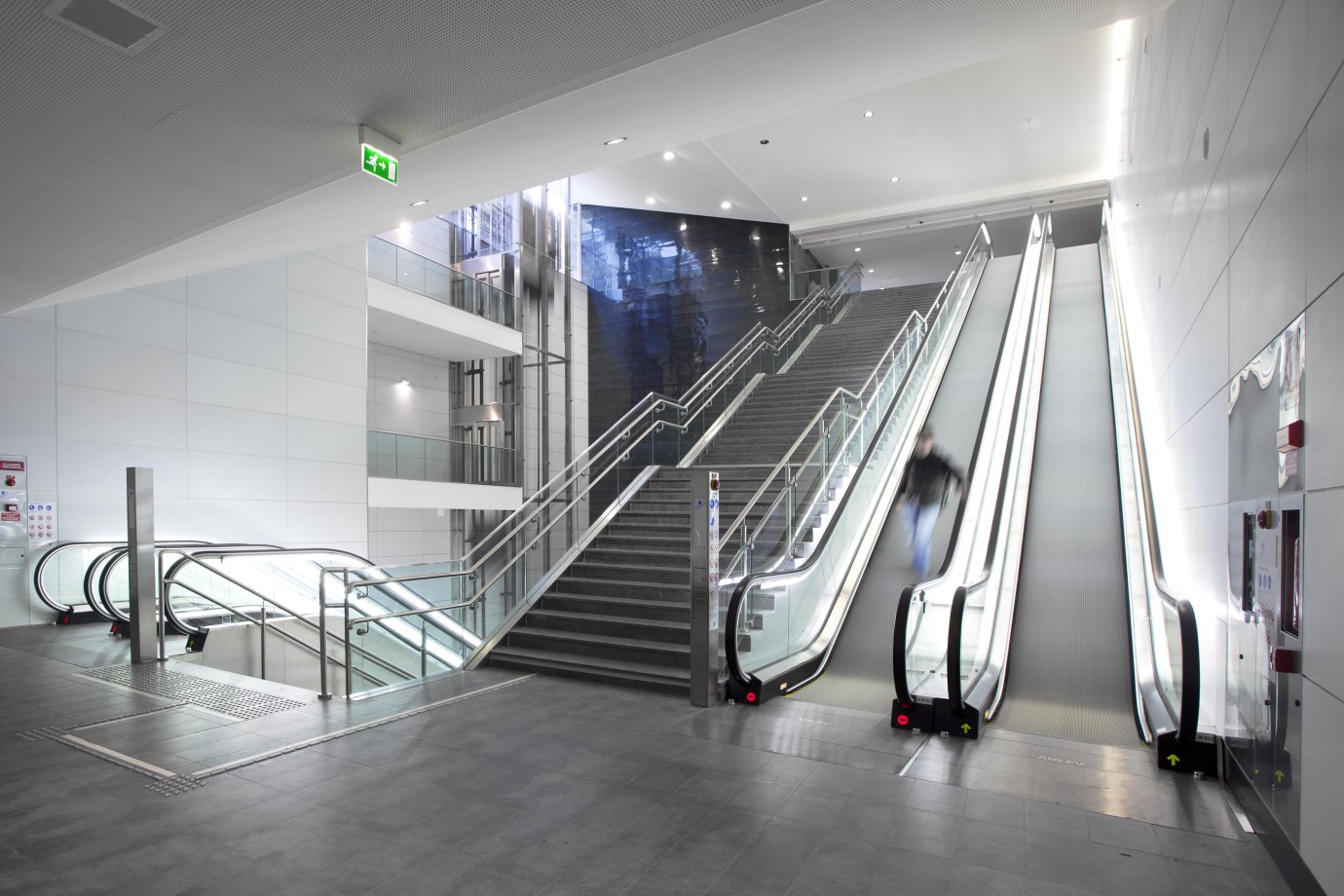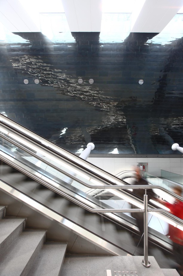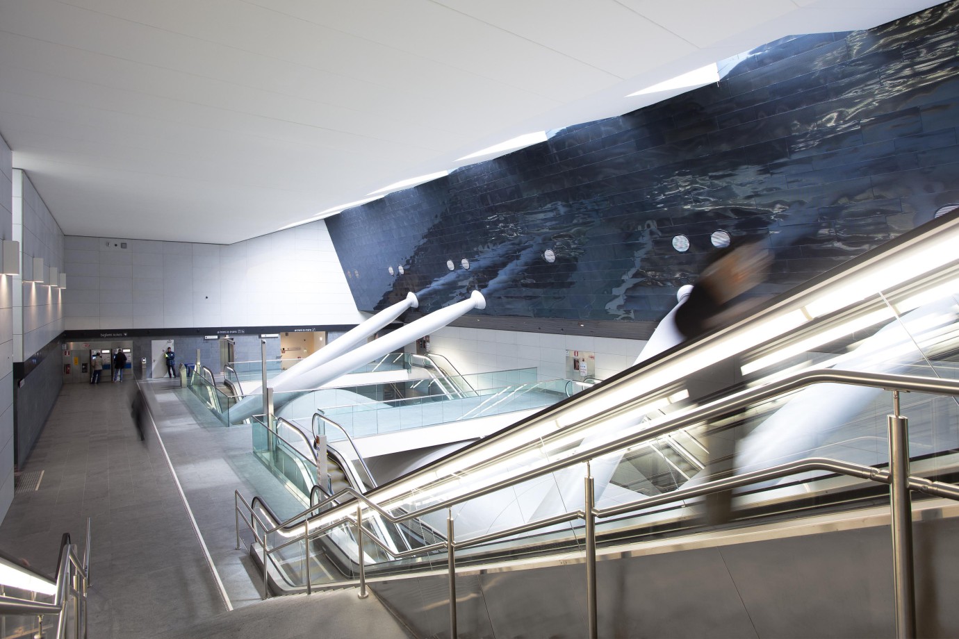 Le stazioni sono state progettate con l'idea di creare continuità tra l'esterno e l'interno, rendendo lo spazio sotterraneo un luogo accogliente, sicuro e ben illuminato. Per farlo, la struttura della stazione è stata aperta per portare luce naturale all'interno, creando un ambiente moderno, pulito e luminoso: questo permette un miglior orientamento e percorsi di circolazione leggibili e visibili. Gli interni sono caratterizzati dal volume della parete inclinata, rivestita da una lamiera di acciaio inossidabile che riflette la luce proveniente dai lucernari. Il volume contiene la maggior parte degli impianti MEP e ha anche una funzione strutturale. Le aree accessibili agli utenti, il pavimento e alcune superfici e elementi sono in diorite, una pietra naturale a metà tra il granito e il gabbro. Ha eccellenti caratteristiche di resistenza, durabilità e funzionalità ed è particolarmente indicata in contesti urbani e infrastrutturali dove si verificano condizioni critiche in termini di usura e sicurezza.